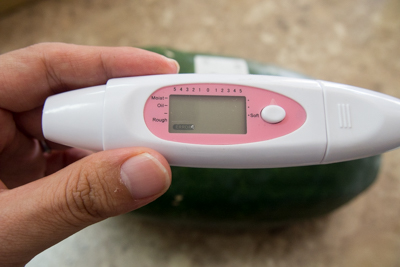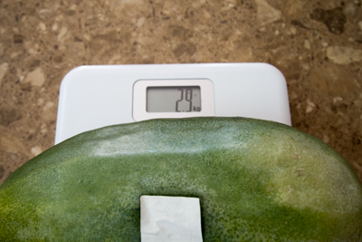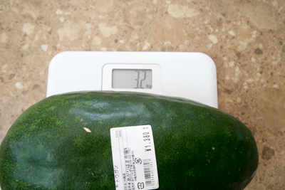 へたの近くがちょっとだけ白く粉をふいていました。このあたりの変化は重さに影響しているのでしょうか?早速ヘルスメーターに乗せてみましょう。
