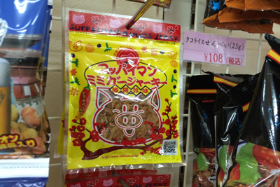 乾燥梅干しはもともとは古くからあるお菓子らしいのですが、人工甘味料チクロが使用されているのが問題になり台湾から輸入されていたものが一度途絶えたらしいのですが、それを別の甘味料(ステビア)に置き換えて上間菓子店が作ったのがスッパイマンということです。