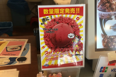 そんなスッパイマンが、なんとブルーシールアイスとタッグを組んで、「スッパイマンシャーベット」なるものを3月1日より販売しているらしいのです。いったいどんなものなのでしょうか?食べてきました。