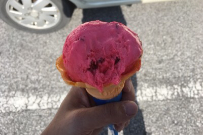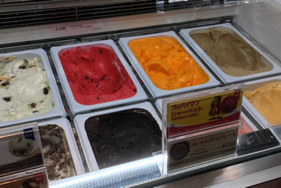 アイスのショーウィンドウで確認すると、ベリー系のアイスか練り消しかというくらい赤いアイスがそこに。何か黒いレーズン的なものも見えます。