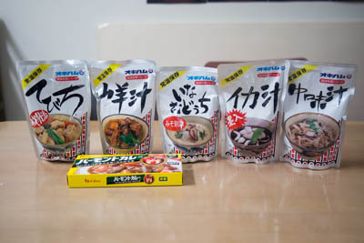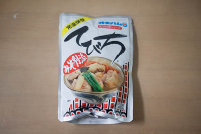 まずはてびち汁。てびちと大根、ニンジンなどの野菜、結び昆布が入っています。粉末味噌が別添えされていて後から溶かすようになっています。てびち汁って普段はあまり食べない気がするのですが、昔ながらのスーパーなんかのお総菜コーナーなんかに置いてあるのは見たりします。レトルトのものは味噌味でしたが、しょうゆ味だったり色々バリエーションがあるようです。