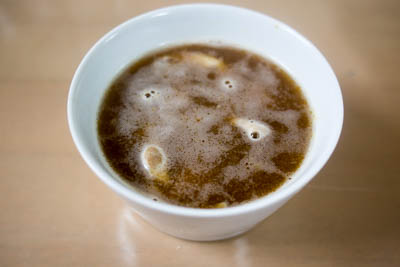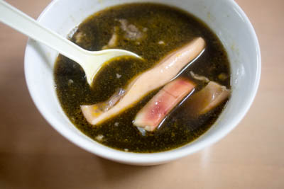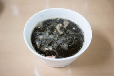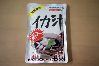 続いては「イカ汁」。見た目のインパクトがものすごい料理ですが、豚肉とイカの汁物で濃厚な味わいです。沖縄の海産物料理屋さんなんかで食べる事ができます。うまいのですが、食べた翌日のトイレでいつも自分の健康状態を疑ってしまいます。