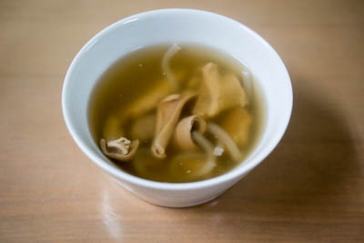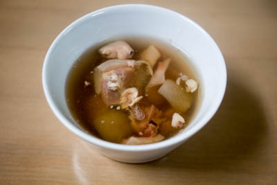 最後は豚の腸を使った中味汁。具材は中身(豚の腸)、こんにゃく、椎茸など。お盆では定番の汁物で薬味にはおろしたショウガを添えたりして食べます。行事ごとでめっちゃ出てくるので余り物がカレーにできるのであればすごい発見なんじゃないかと思います。