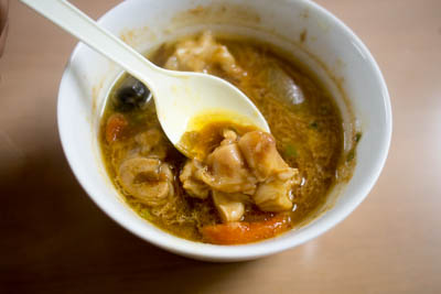 てびち汁をカレーにした「てびち汁カレー」ですが、見た目的には表面の脂がすごいことになってます。あまり期待せずに食べたのですが、かなりうまいです。ちょっとあっさり目の味付けなてびち汁ですが、カレーを入れることによってものすごくコク深い味わいに。これ、商品開発したら売れるんじゃないかと思うんです。