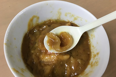 最後は中味汁。結構期待していたのですが、中身のにおいとカレーの香りが致命的に合いません。お盆でめちゃめちゃ作って余ることもある中味汁ですが、カレーにするのは厳しそうなので、また別の調理法を考えたいと思います。