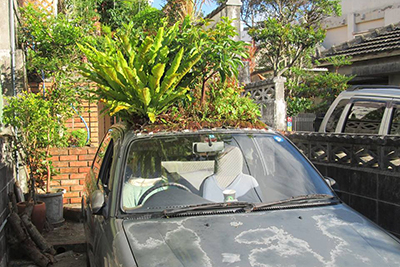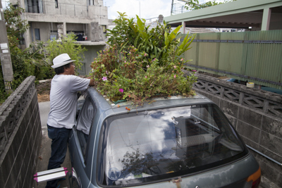 これまで2回の記事を読んだ方ならご存知かと思いますが、この車はもともと屋根に芝生を生やせば涼しくなるのでは?というアイデアからはじまっています。しかしいつのまにか、苔が生え、花が咲き、今ではガジュマルやアコーなどが勝手に自生してしまった不思議なことになっています。