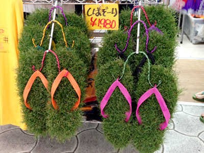 「夢市場」にあるユニークな商品とは、芝(しば)と島ぞうりを掛け合わせた「しばぞーり」。