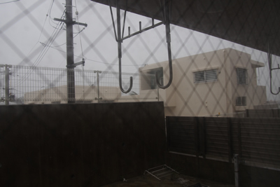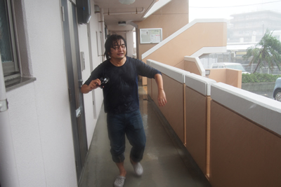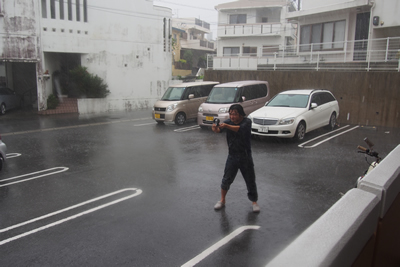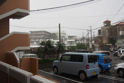 写真で見るとそんなでもないのですが、横殴りの雨、そして時折ふらつくくらいの風が吹いてます。家の前なんで全くの普段着で出てしまいましたが、皆さんは台風が近づいている間は不要な外出を避けるとともに、どうしても外出しないといけない場合はかならず安全を確保してくださいね。