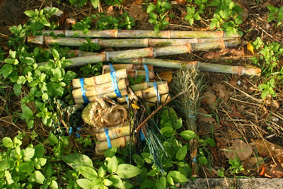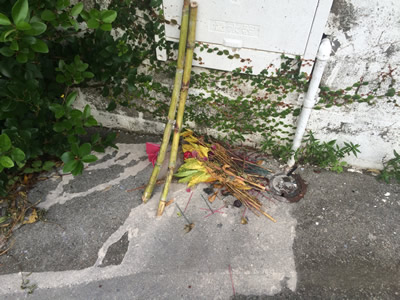 まずはこちら。杖となるサトウキビ、グーサンウージと線香の燃えかす、花がついてない緑色の植物です。ちょっと赤く見えるのはブーゲンビレア。花代わりに置かれたのでしょうか。