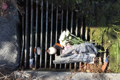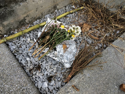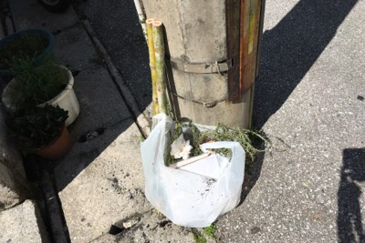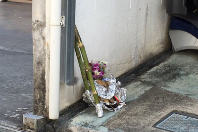 こちらは電柱に寄りかかる形で置かれたもの。緑色の植物はどうやら榊っぽいです。線香はヒラウコウですね。