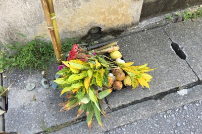 離島なので若干供え物には差異があるような気がします。よく分からないつぶつぶした植物含め、多分意味があると思われるので何かの折に調べてみたいと思います。
