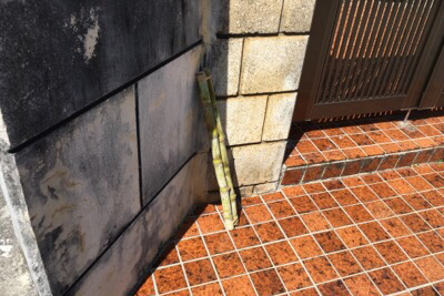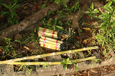 花とチトゥ、ヒラウコウのパターン。奥の方のサトウキビは若干長いので杖代わりかもしれません。それにしてもこの家のサトウキビは太い。