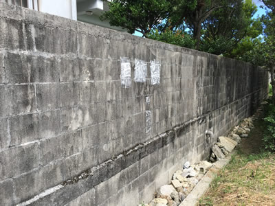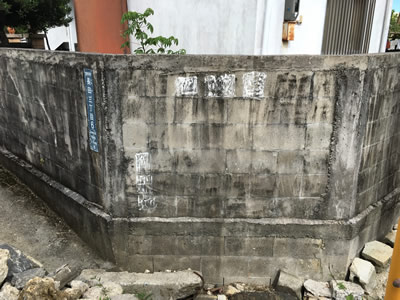 わざわざブロック塀にセメントを盛って石敢當に角度をつけて設置しています。