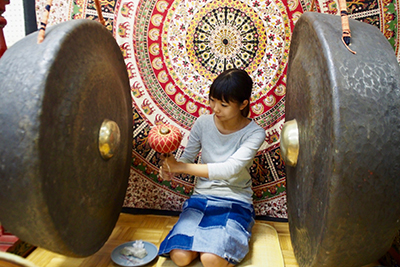 私もいちばん大きな楽器「ゴング」に挑戦。ゴォ〜ンと凄みのある音とともに、振動で体が震えます。鳴らす前から、叩くための棒が重くて腕がプルプル震えていましたが。