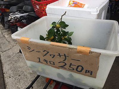 車で通っているときははっきりわからなかったんですが、意を決して車を停めてお店の前に立つと、どさっとシークヮーサーがありました。