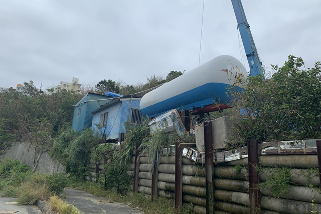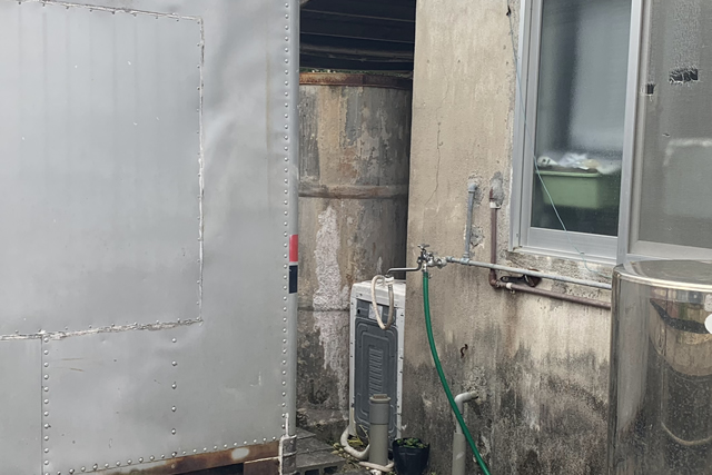 タンクローリーとかに乗ってそうなデカいタンクが目につくけど、よく見ると屋根からの配管が通っている。天水タンクだとしたら最大級じゃないだろうか。