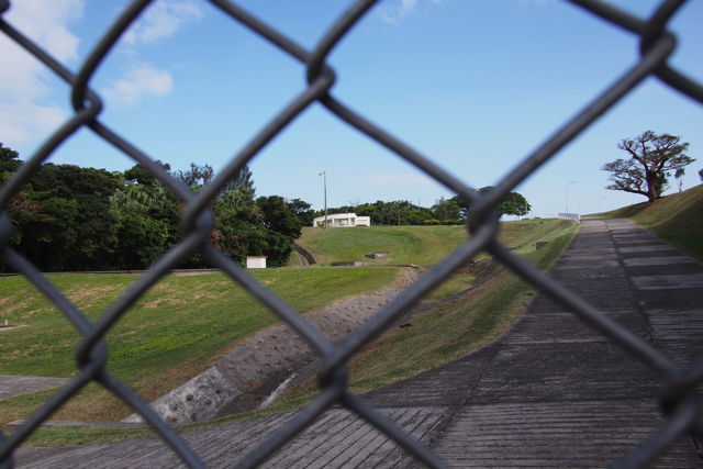 あとから地図を確認してみると、米軍施設キャンプ・バトラーのようです。フェンスの向こう側には人気はないものの、なにかしらの建物が見えていました。