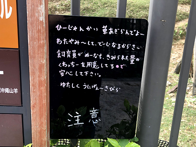 訳すと「ヤギに草をあげないでください。腹がいたくなって大変です。飼育員が毎日決められた量のごちそうを用意しているので安心してください。よろしくおねがいします。」なんですが、結構大切なことをなぜ、ぬーんちぜんぶうちなーくとぅばっし言ちゃるのやいびーがさい。いや、しちやいびーんしがやー。