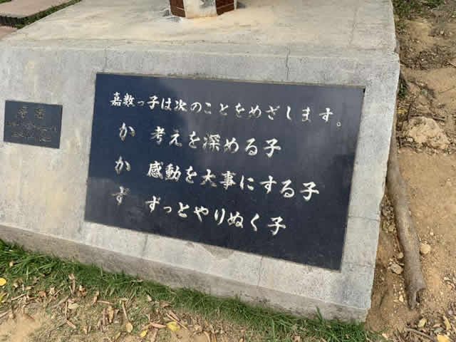 こちらは宜野湾市の嘉数(かかず)小学校。「か」がふたつ被っていますが、「考えを深める子」「感動を大事にする子」とまとめています。