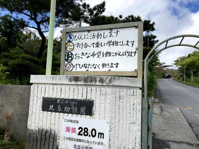 南風原町の北丘(きたおか)小学校。なんだか他の学校に比べて「きびんに活動」「大きな希望を胸に」「かげひなたなく」とちょっと毛色が違います。結構昔に作られてそうな感じがしますね。