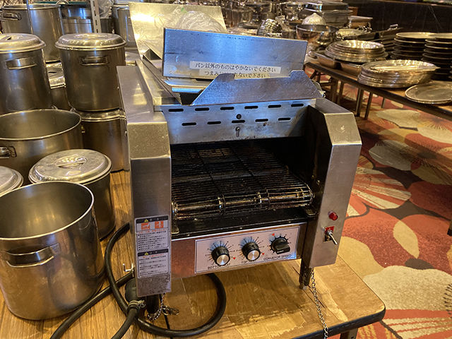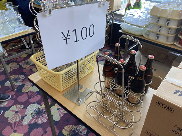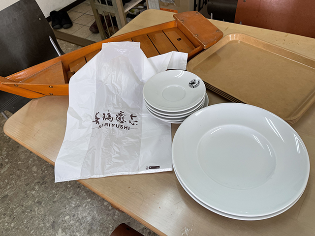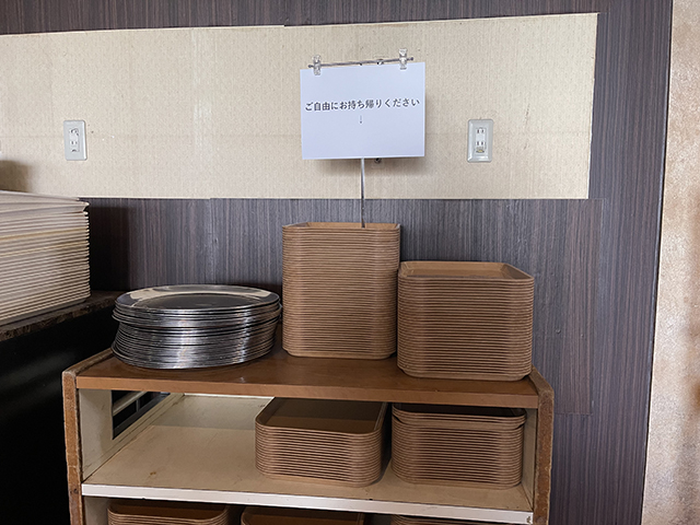 元々は披露宴が行われていたフロアが会場になっており、さっそく「ご自由にお持ち帰りください」と使われていたお盆がドーンと置かれていました。