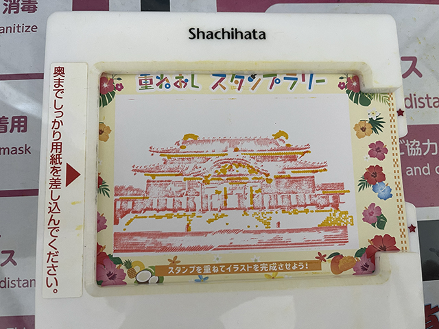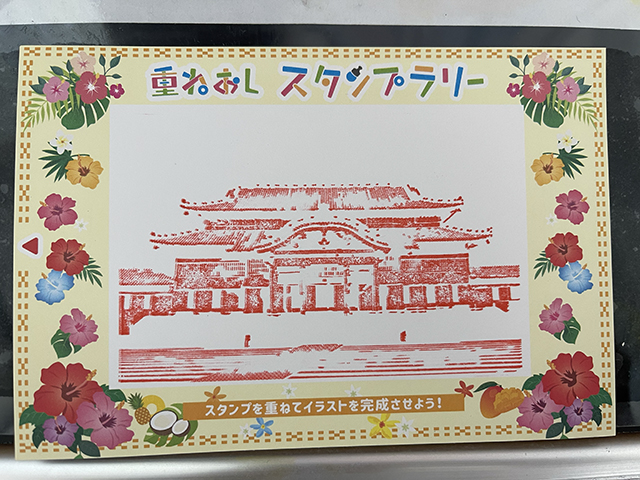 全部押すときれいな首里城の絵葉書が完成するという、重ねおしスタンプラリーらしいです。