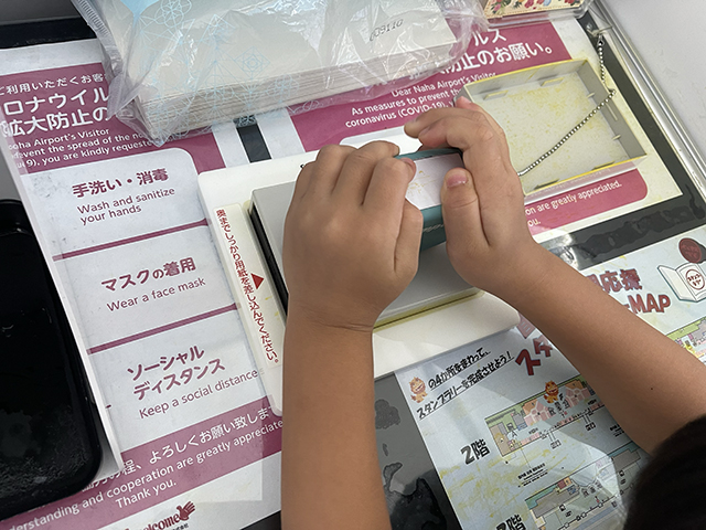 那覇空港で行われている首里城復興応援の重ねおしスタンプラリーをやっている。まわらないと見えない首里城をお見せします。