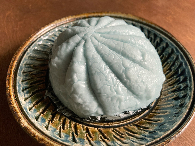 沖縄ファミリーマートから10月11日に発売された新商品「ちゅらうみまん」。食欲をそそらない青さだが、食べてみるとうまかった。