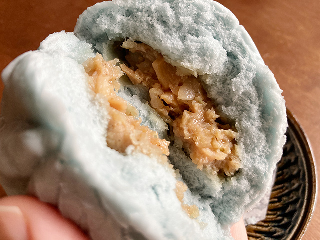 かじりつくと、豚肉がゴロゴロ入ったとても美味しい肉まんでした。皮に練り込まれたバタフライピーの風味?みたいなものは特に感じられず。
