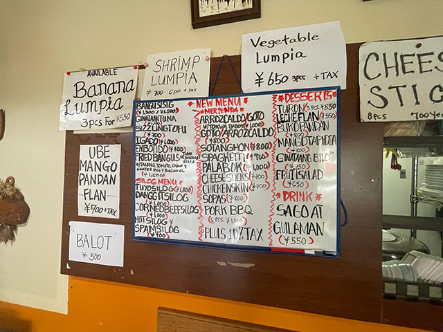 メニューです。英語をなんとか読んでも、フィリピン料理が想像できなさすぎてどんな料理かぜんぜんわかりません。