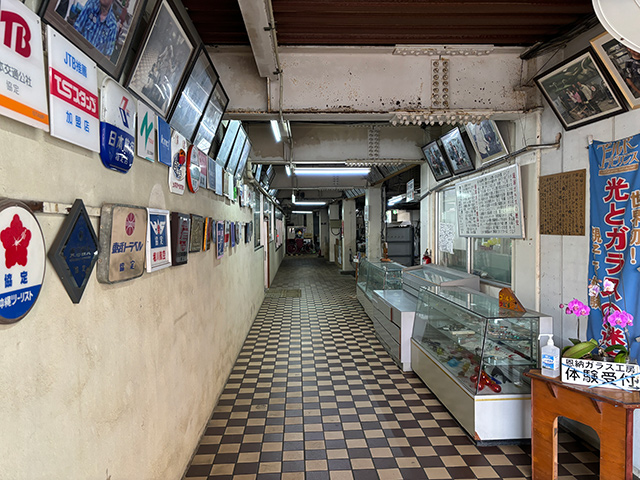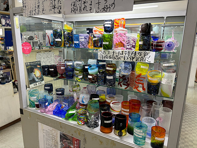 建物1階は「恩納ガラス工房」として、以前と同じく琉球ガラスの販売や琉球ガラス作り体験施設があります。昭和っぽさを感じる雑多で独特な雰囲気も変わらずそのまま。