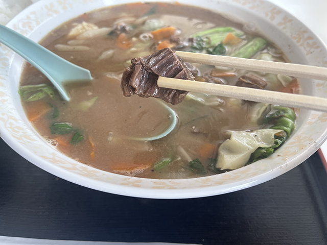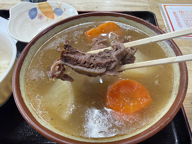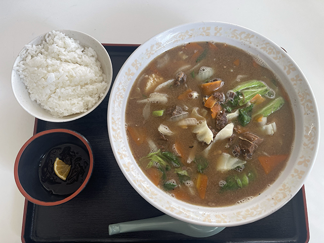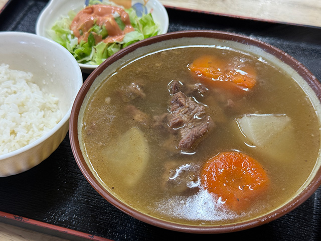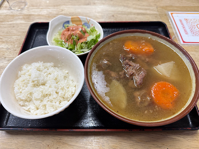 馬肉はよく煮込まれていて柔らかく、旨味がぎゅっと詰まっている感じ。写真ではあまり見えていませんが、汁の中に馬肉がたっぷりと沈んでいて食べ応え抜群。汁はこってり濃厚ながら、しつこさはなく最後までおいしく食べきることができました。食堂の名にふさわしく、まさに“まんぷく”になりました。