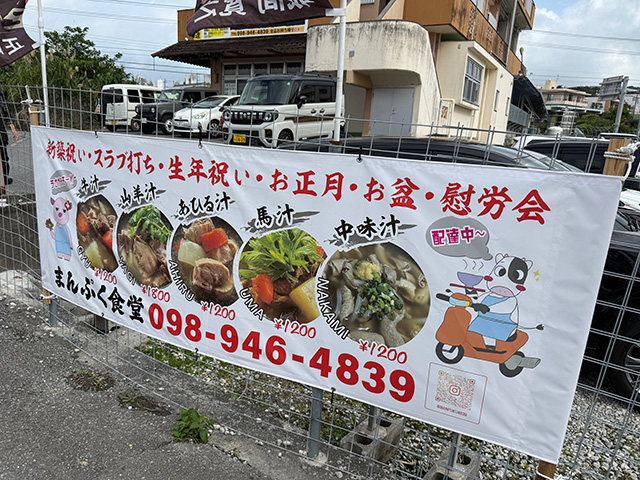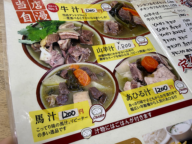 馬汁の他に、牛汁、山羊汁、あひる汁、中味汁など汁物メニューが豊富。沖縄ならではの「スラブ打ち」(いわゆる「上棟式」に相当するお祝いの儀式)などの行事にもよく利用されているようです。なんと配達も可能(ドライバーは牛ではないと思いますが)。