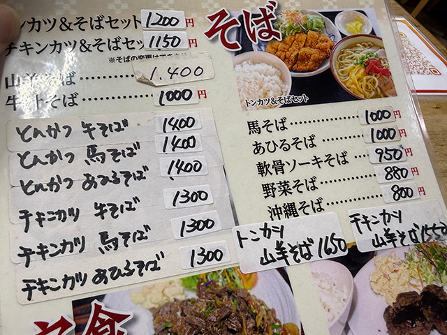 「馬そば」もありました。おそらく沖縄そばの汁が馬汁に置き換わったものだと思いますが、さらに「とんかつ馬そば」「チキンカツ馬そば」となってくると、もう何が何やら分かりませんね。