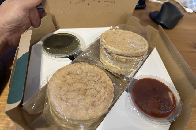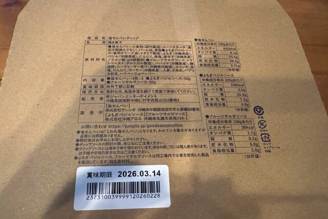 裏の表記はこんな感じ。塩せんべいはサンシオさんの塩せんべい、ソースはフルーツサルサとよもぎバジルソースの2種類が付属しているようです。