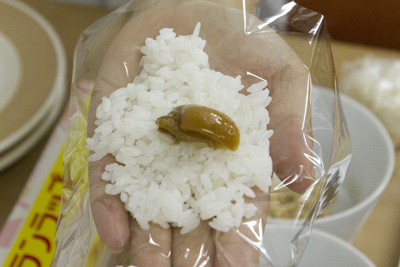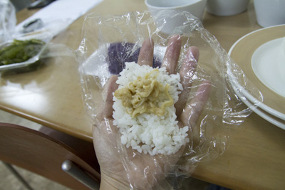 おにぎりを握るごとに水気が多いのでしみ出してきます。