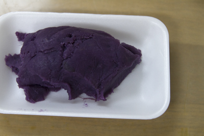 ターウムニーとは田芋と砂糖を混ぜて練った料理です。これは紅芋も入っているためキレイな紫色に。