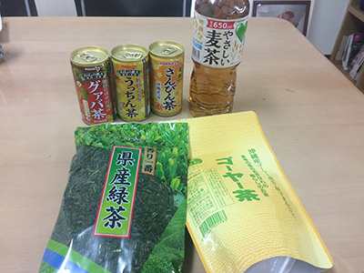 用意したのは、グァバ茶、うっちん茶、さんぴん茶、県産緑茶、ゴーヤー茶の5種類。