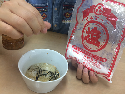 最初の段階で美味しくなければ記事として成り立たないので、冷やご飯の上に刻み海苔と、白ごま、そして塩を入れました。