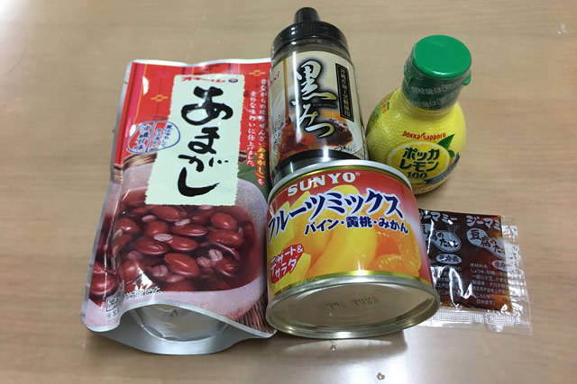 あまがし、黒蜜、レモン、フルーツミックス、ジーマミー豆腐のタレです。なんだかクセが気になる凍らせジーマミー豆腐に合うものを探します。