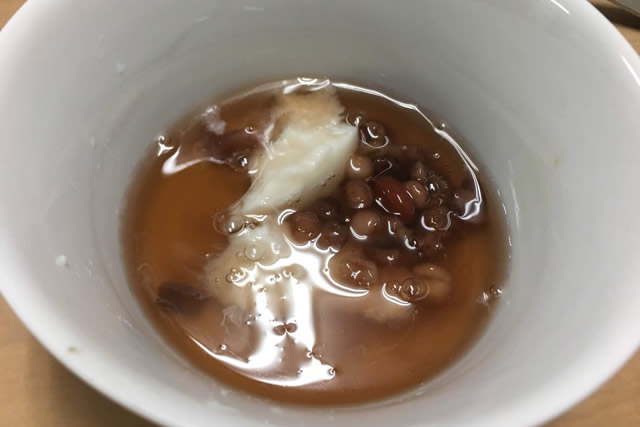 黒蜜で調子づいて、続いてはあまがし。緑豆と押し麦を甘く煮たもので、沖縄ではユッカヌヒー(旧5月4日)に食べられていたらしいです。これはあまがしが強すぎて(かなり甘い)、ジーマミー豆腐の味が全くせず。双方の分量のバランスにもよるのかもしれません。