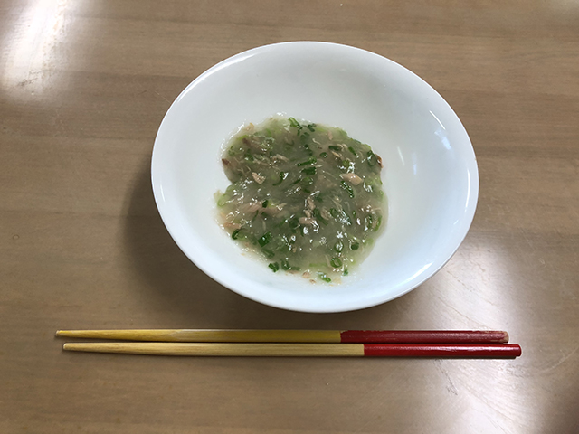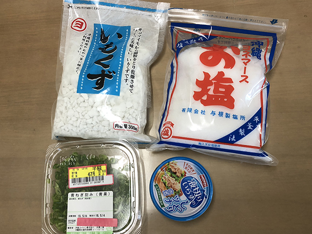 今回はいもくずの他に、調味料として塩、だしの代わりにツナ缶、そしてカットねぎを用意しました。