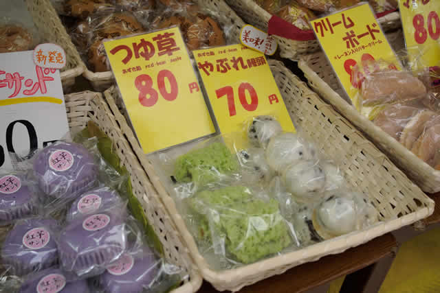 こちらで販売されているつゆ草はひとつ80円。話を聞いてみると、60年くらいの老舗だが、つゆくさは昔からあるお菓子で多分60年前くらいもあったんじゃないかとのこと。