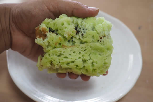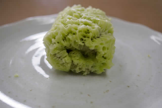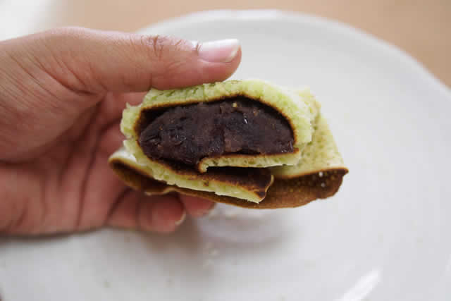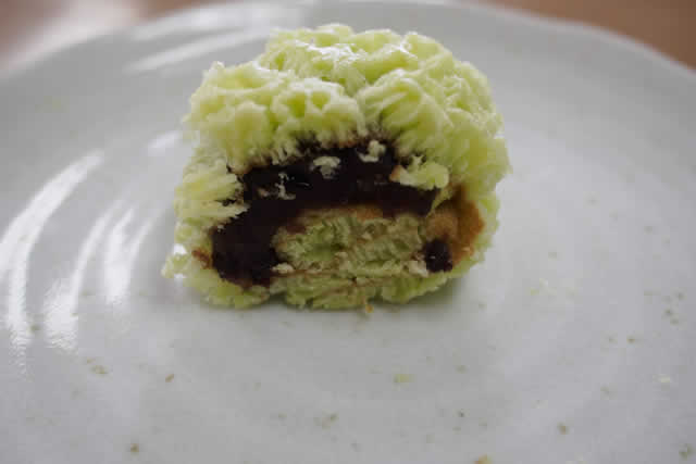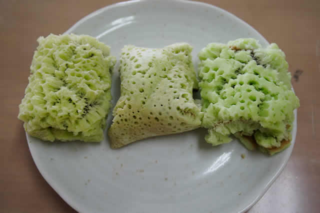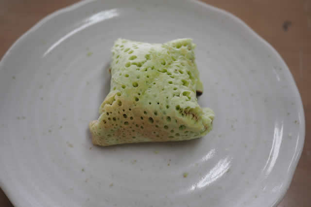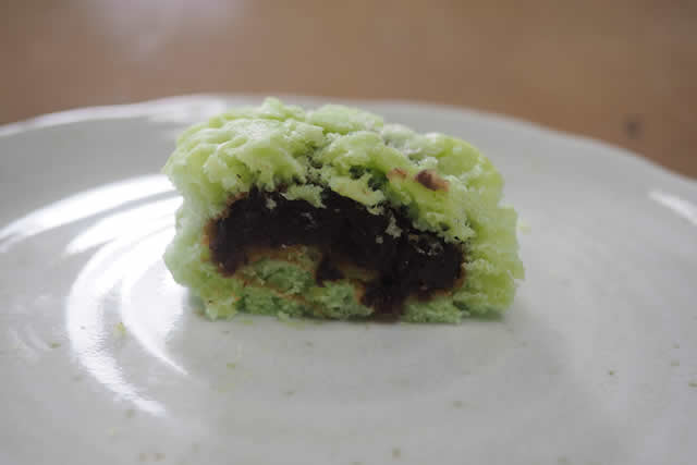 片面だけ焼いたホットケーキ生地みたいなものにあんこが包まれているお菓子なのですが、ちょっとびっくりするのはその色。緑色です。しかもこの緑色、ヨモギだったりが混ざっているわけでもなく食紅的なもので色がつけられている模様。そして多分このお菓子が売られているのは沖縄だけ。というかネットで調べてみてもほとんど情報が無いのです。