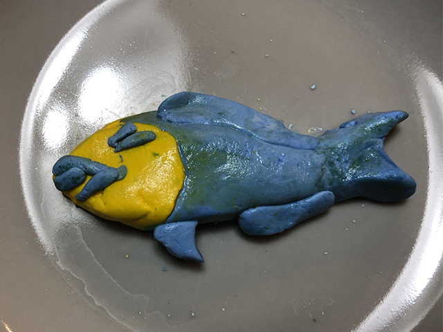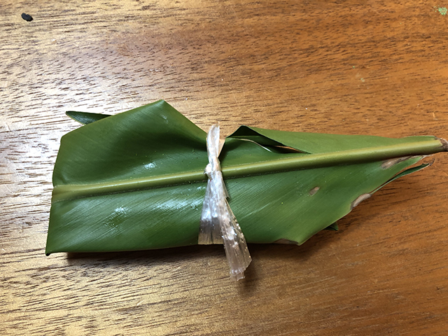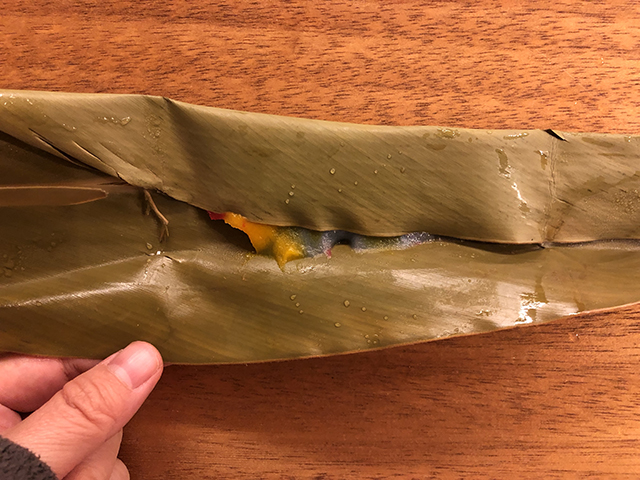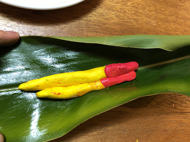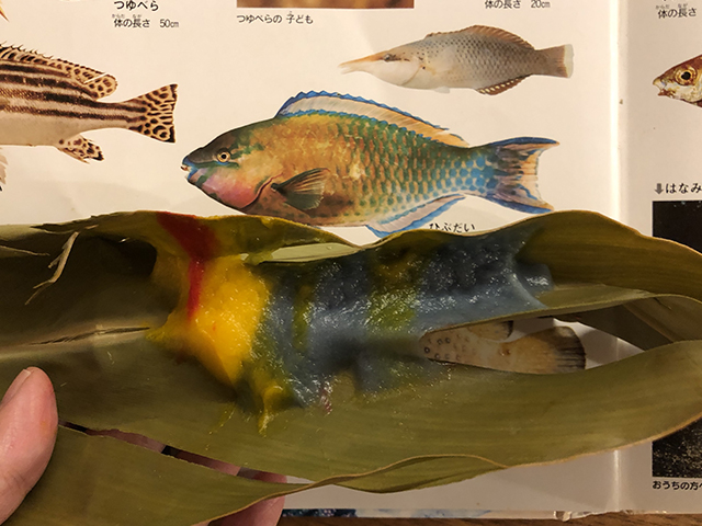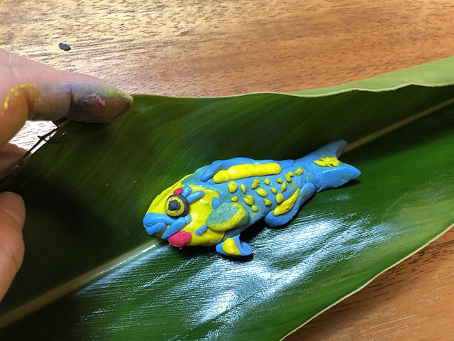 カラフルムーチーをどう使おうか考えたところ、月桃の葉っぱを開いたら魚がいたら楽しいんじゃないかと思って 。