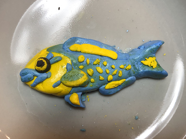ムーチーの日は終わったがムーチーを作った。カラフルなムーチーにして沖縄のカラフルな魚を作りたかった。