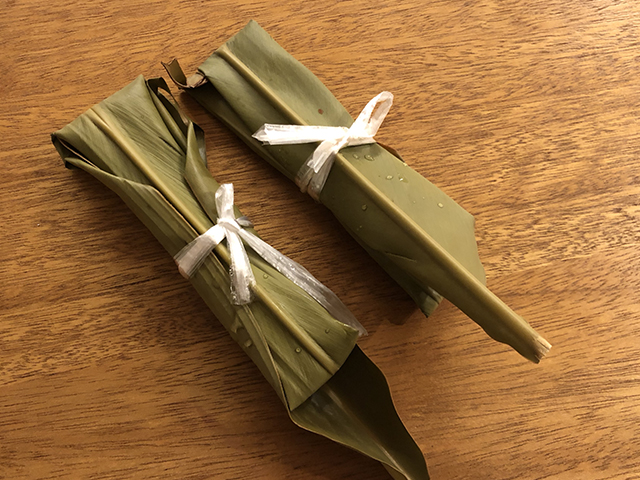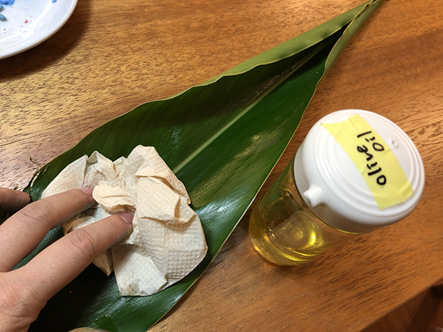 ムーチーが月桃の葉にひっつかないようにあの記事を参考に、今回は表面に油を塗っておきます。
