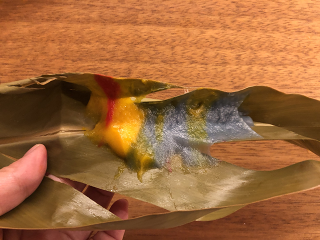 時間をかけてカラフルムーチーをこねて、造形をして、蒸したのに、最終的に葉っぱにくっついてドロドロした色づいた何かになりました。