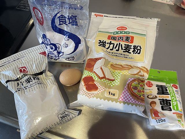 沖縄そば麺は強力小麦粉、塩、重曹、たまごがあれば10分程度で作れます。