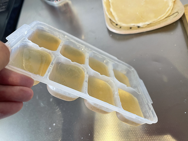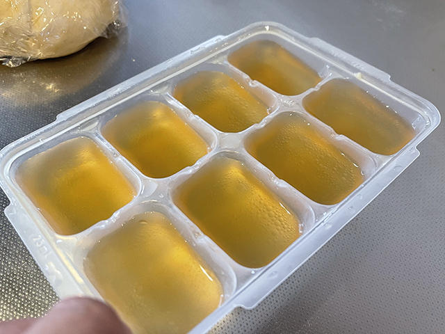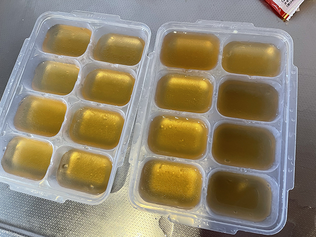 赤ちゃんにかかってしまいそうな沖縄そばだしはゼラチンで固めます。